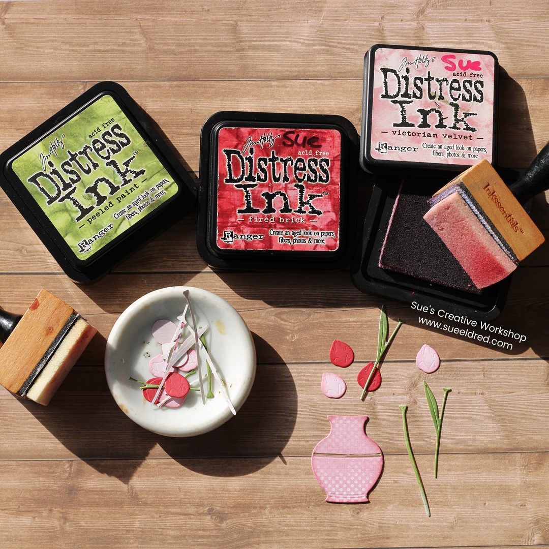 - Add Depth with Ink: Ink the small die-cut pieces with Tim Holtz Distress Inks*. This adds beautiful depth and richness while covering the white core of the paper.
