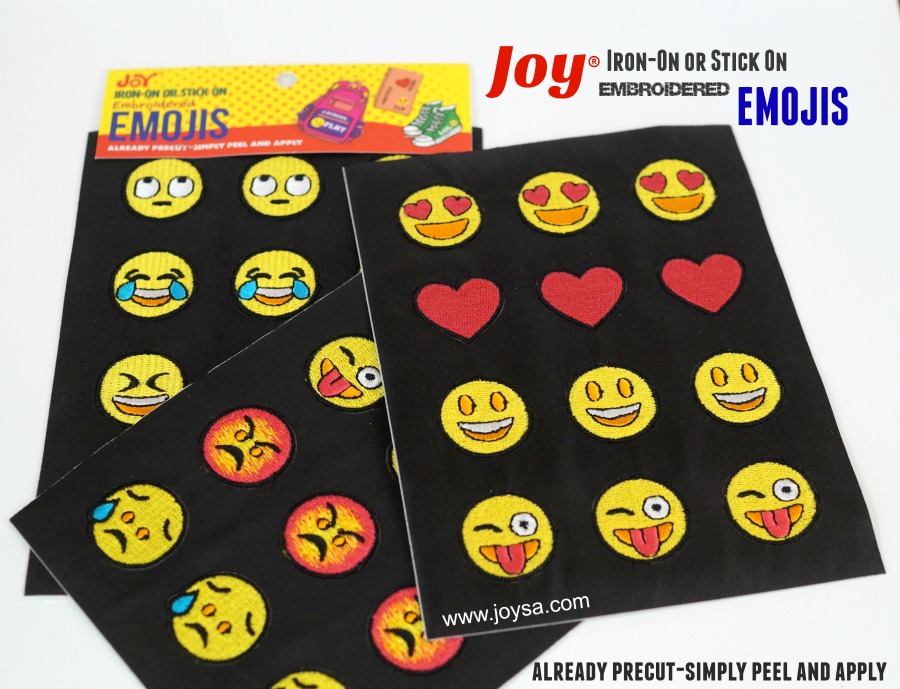 My teenage son was intrigued when I showed him my stack of new Emoji iron-on patches.