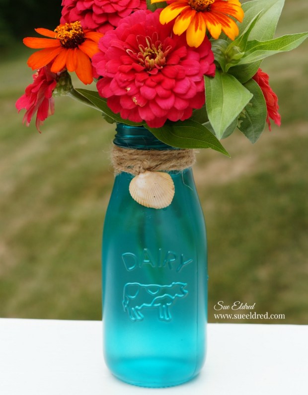 To go with the Beachy Sea Glass look, I wrapped twine around the neck of the Milk Bottle*