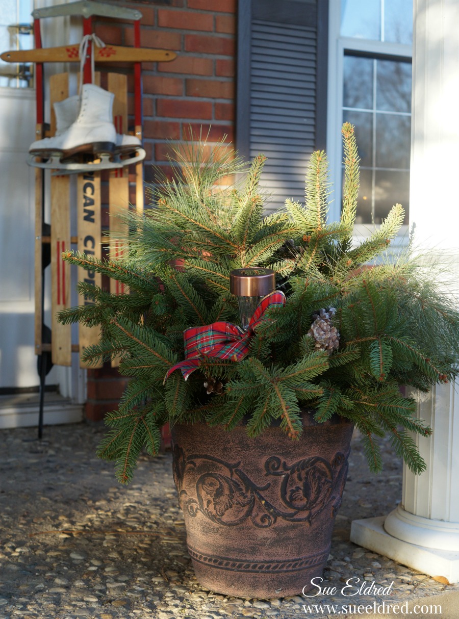 Merry Christmas! Love your porch! I too fill my pots with greens and I have the kids old sled and my skates on it. Great minds think alike!