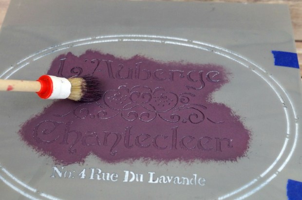 5.  Position The French Inn stencil over the top of the box.  Secure the stencil in place with the     painters tape to prevent slipping.  Use stipple brush to apply a mix of Relic, Romance & Everlasting paint to the decorative element in the center of the stencil.