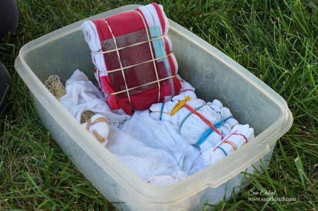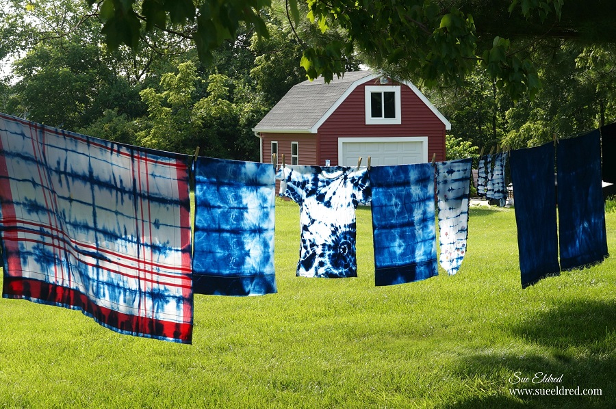 Once dyed…we hung the items on a clothesline tied between two trees in the front yard.