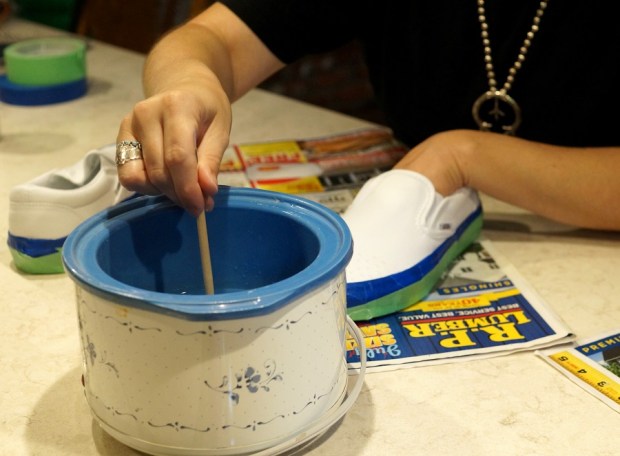 A large brush was used to paint the dye on the shoes instead of dipping them.