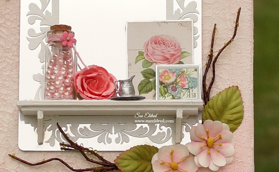 - Decorate the mantle with a small jar filled with pink pearl beads, a miniature pewter pitcher and saucer, and the floral scrapbook pieces.