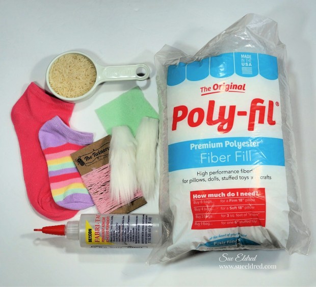 - Place the 1/3 cup of rice into the sock and add poly-fil.