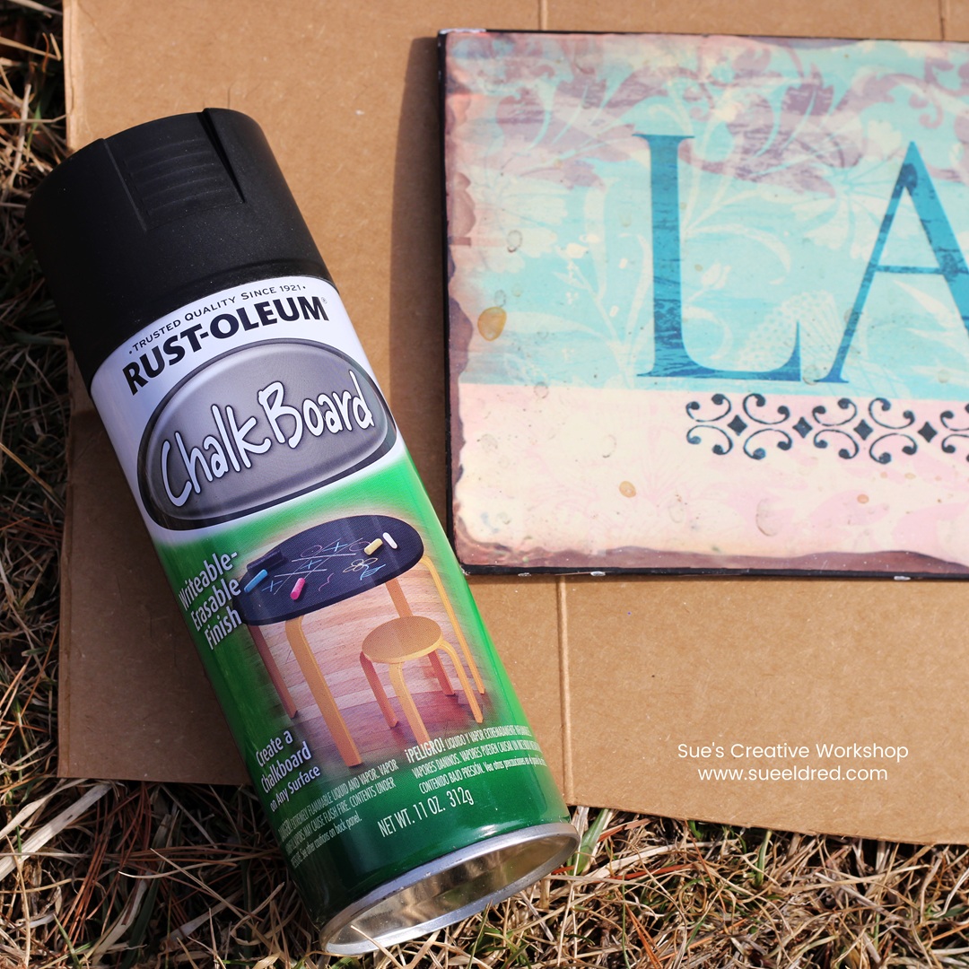 • I spray-painted the sign with leftover Black Chalkboard paint* to give it a matte finish.