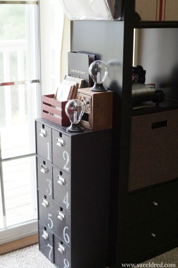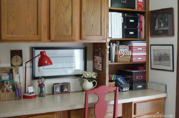 My best advice would be to create a “home” for everything and put it away as soon as the project is finished. Some people find inspiration in seeing all their “pretties” out on a shelf. I’m a fan of closed door storage; I don’t work well in chaos. I have an extremely small work space, so I must be organized or things can easily get out of hand. I like using baskets, crates, mason jars and old drawers for storage. Keeping it visually fun and appealing helps me want to keep it clean.