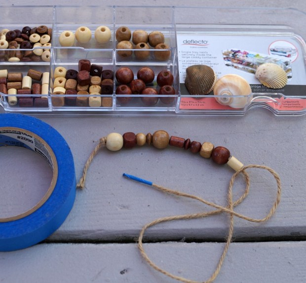 - Add a couple of beads to a piece of twine. Tie twine to each end of the stick to use as a hanger.