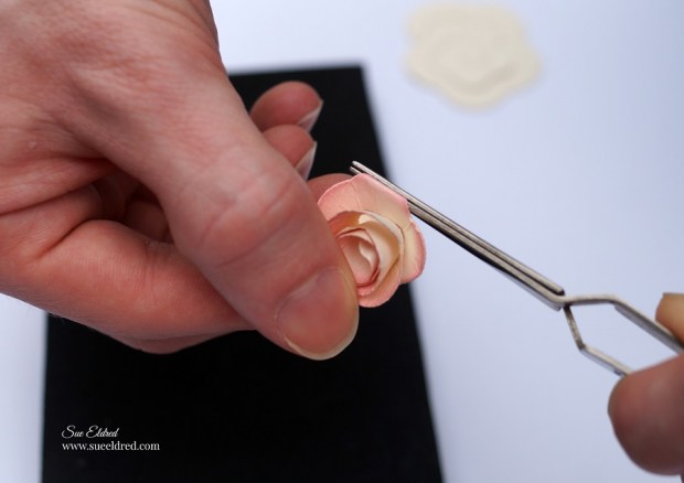 to grasp the side of the flower and roll it back to form the natural curve of a petal.