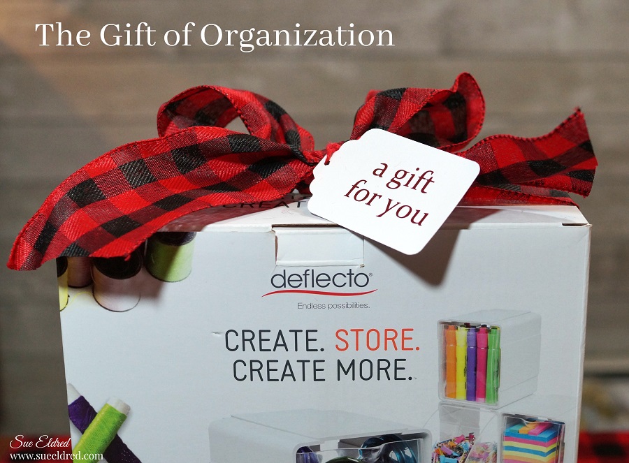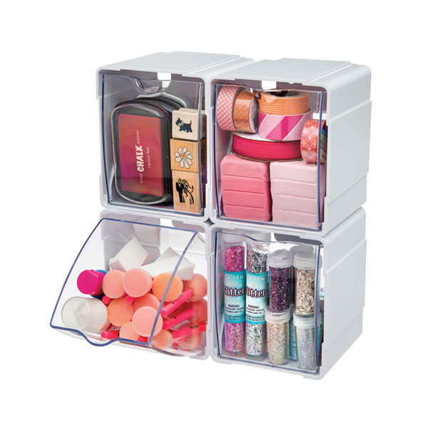 Purchase inexpensive photo storage boxes in the same color or pattern to bring calm to the clutter. Perfect for Craft Room, Office or most any room of the house.