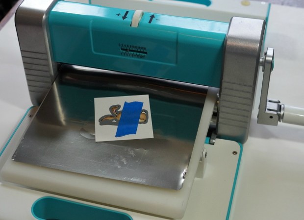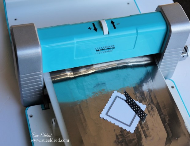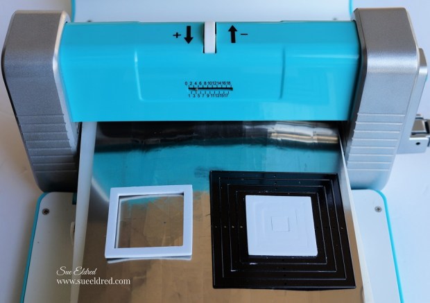 - Place a piece of double-sided craft foam onto the square foam cutter die to cut small foam squares to use under the scallop frames.