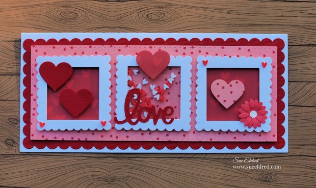 - Embellish the front of the card using hearts popped up with double-sided adhesive foam and the word “love” die-cut using the “Special Delivery” die set.