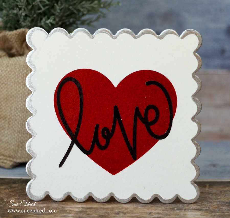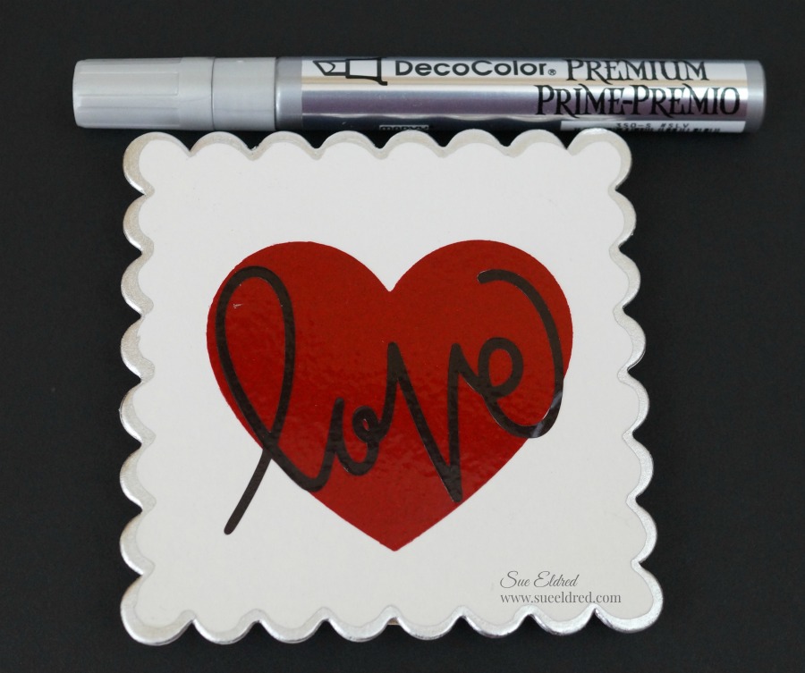 - Cut a heart out of Translucent Red Glittered Vinyl from Tape Technologies using a thin metal die. Apply the glitter heart to the coaster using a transfer paper made for vinyl.