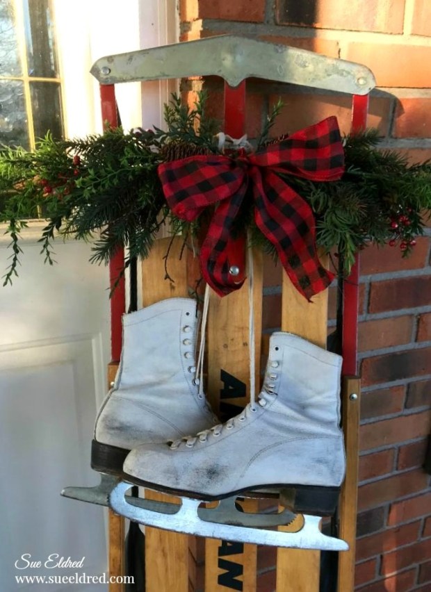 The front door has a simple wreath and a decorated sled.