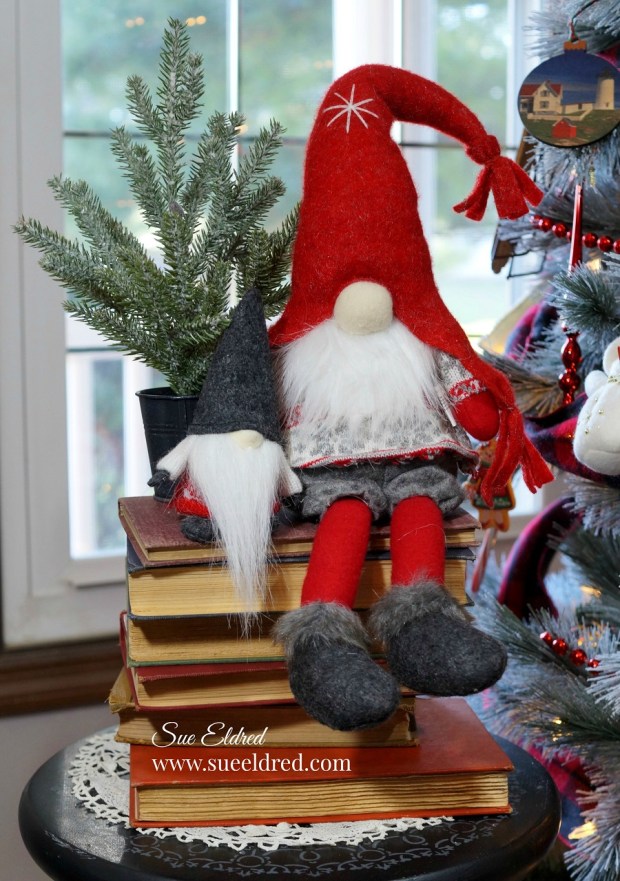 While working on the decorations, I moved these gnomes on top of the books because my little pup thought they were dog toys. I liked the way they looked, so I kept them there.