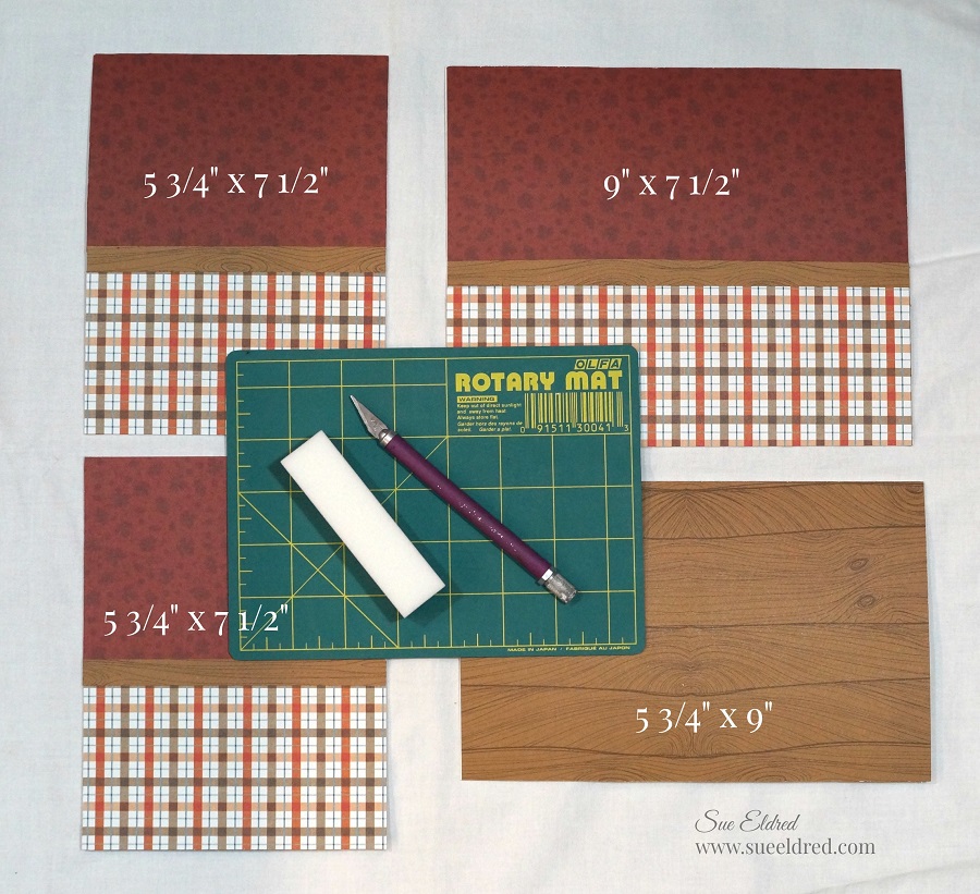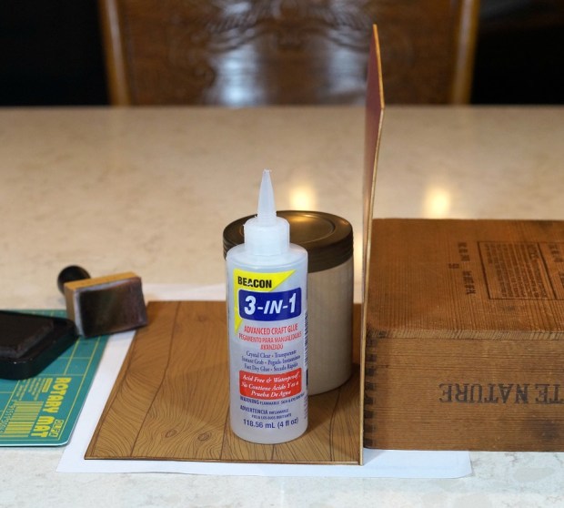 - Cover a 4″ x 5 ½” piece of mat board* with decorative scrapbook paper.