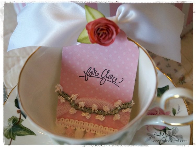 - Wrap a small strip of satin rhinestone around the 1½ satin ribbon and securing the ends with a glue dot.