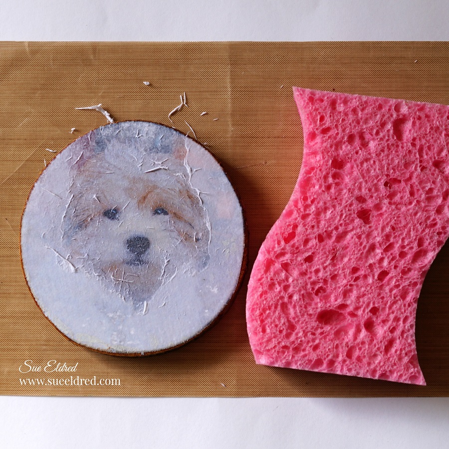 - Wet a sponge with water, squeeze excess water from the sponge then dampen the exposed backside of the image transfer. Immediately as the paper is wet, an image will appear. Allow the wet image to rest a couple of moments to soften the paper.